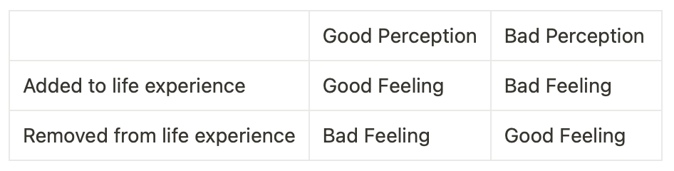 Simply put: a good feeling comes when something bad goes away, or something good comes our way. Conversely, a bad feeling comes when something good goes away, or something bad comes our way.